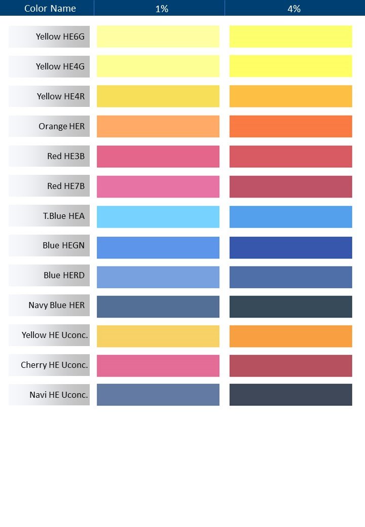 Product placementLight Shades Yellow HE4R/RED HE3B/Blue HERD Medium - Deep Shades Yellow HE4R/Red HE7B / Navy Blue HER Support Dyes Yellow HE6G/Yellow HE4G/Orange HER/Turquoise Blue HEA Difficult Substrate Viscose,Mercerised Cotton,Post Mercerization Light Shade Yellow HE UConc./Cherry HE UConc./Blue HERD Medium - Deed Shade Yellow HE Uconc./Cherry HE UConc./Navy HE UConc.